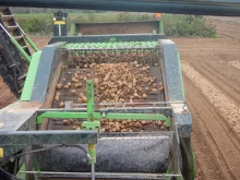 L’arrachage en 2 temps nécessite du matériel spécifique et adapté : l’arracheuse doit redéposer les plants sur le sol, tandis qu’une sorte de débardeuse ramasse les tubercules et les amène dans la benne avant mise en caisses.