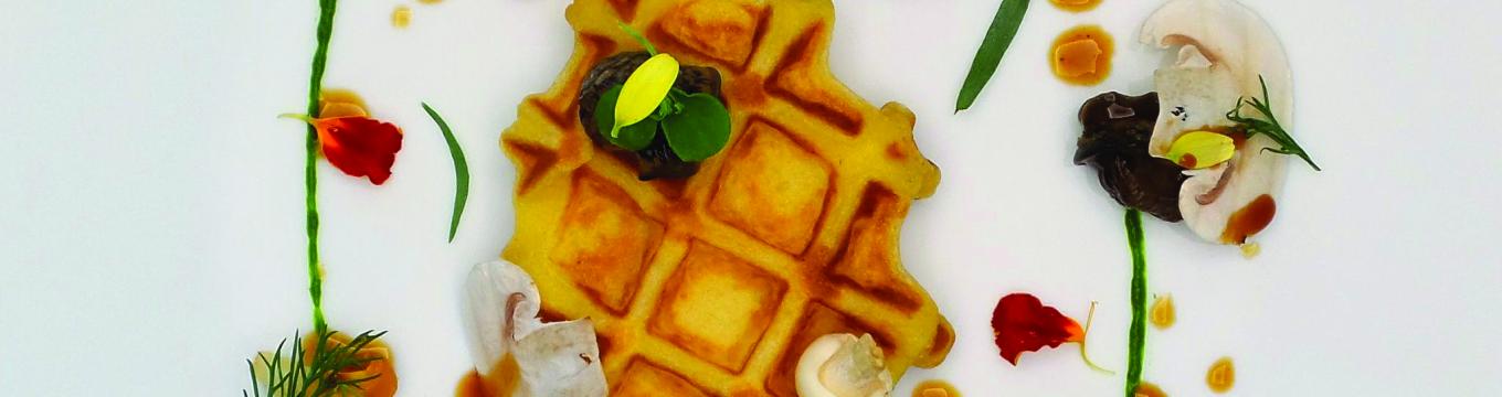 Gaufre de pomme de terre, petits gris de Warnant, champignons, coulis de persil et espuma