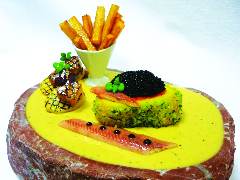 - Réchauffer la Bintje farcie et faire une quenelle de caviar par-dessus juste avant de servir. Napper l’assiette de sauce et mettre également les rondelles de Bintjes grillées à réchauffer avec les dés de foie gras également. Finir par les frites bien croustillantes et les peluches de shizo pour décorer