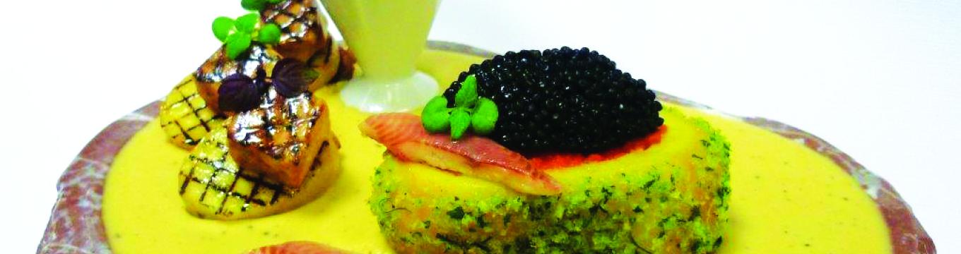 Gaufre de pomme de terre, petits gris de Warnant, champignons, coulis de persil et espuma